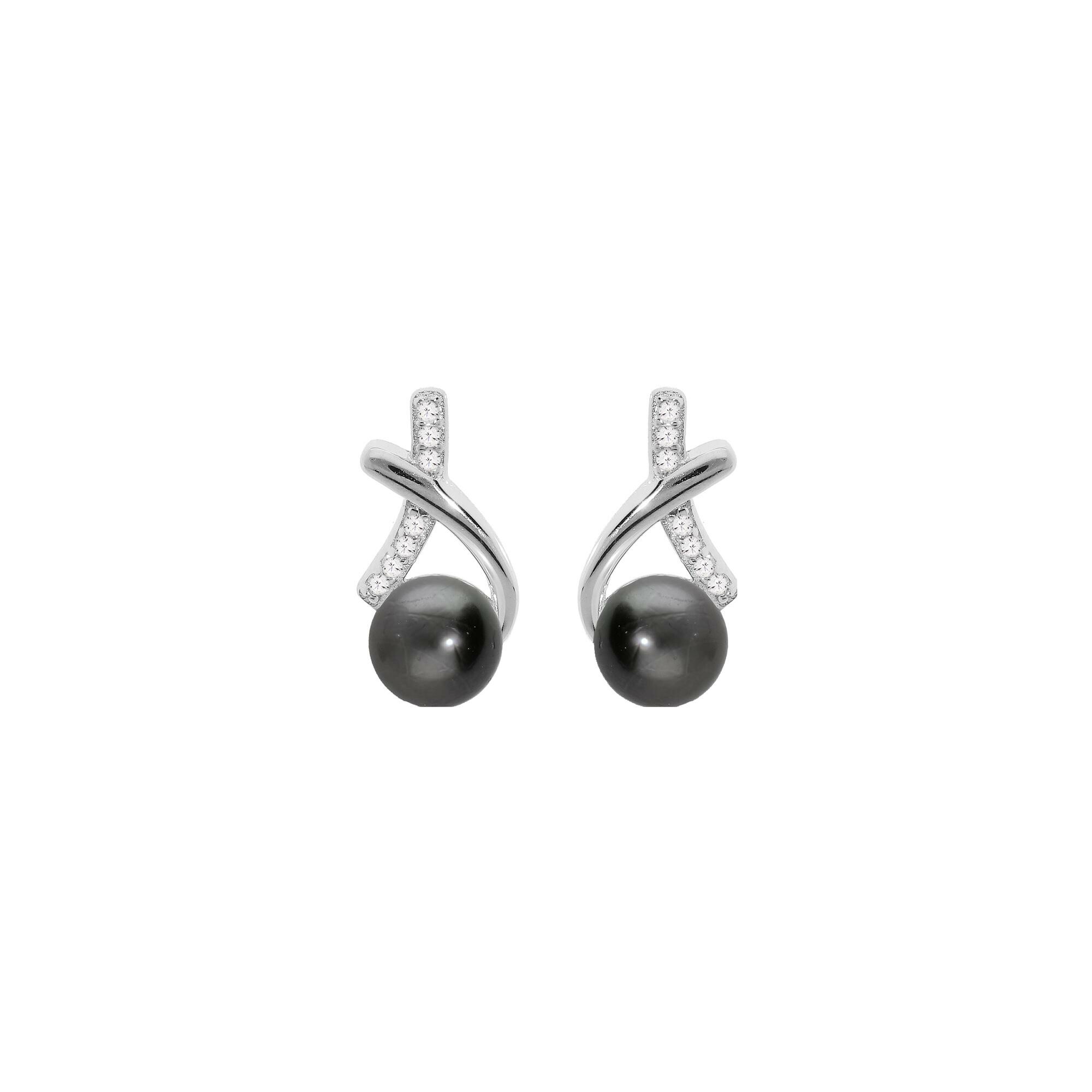 Boucles d'oreilles tige argent rhodié perle de culture de tahiti véritable et oxydes blancs sertis
