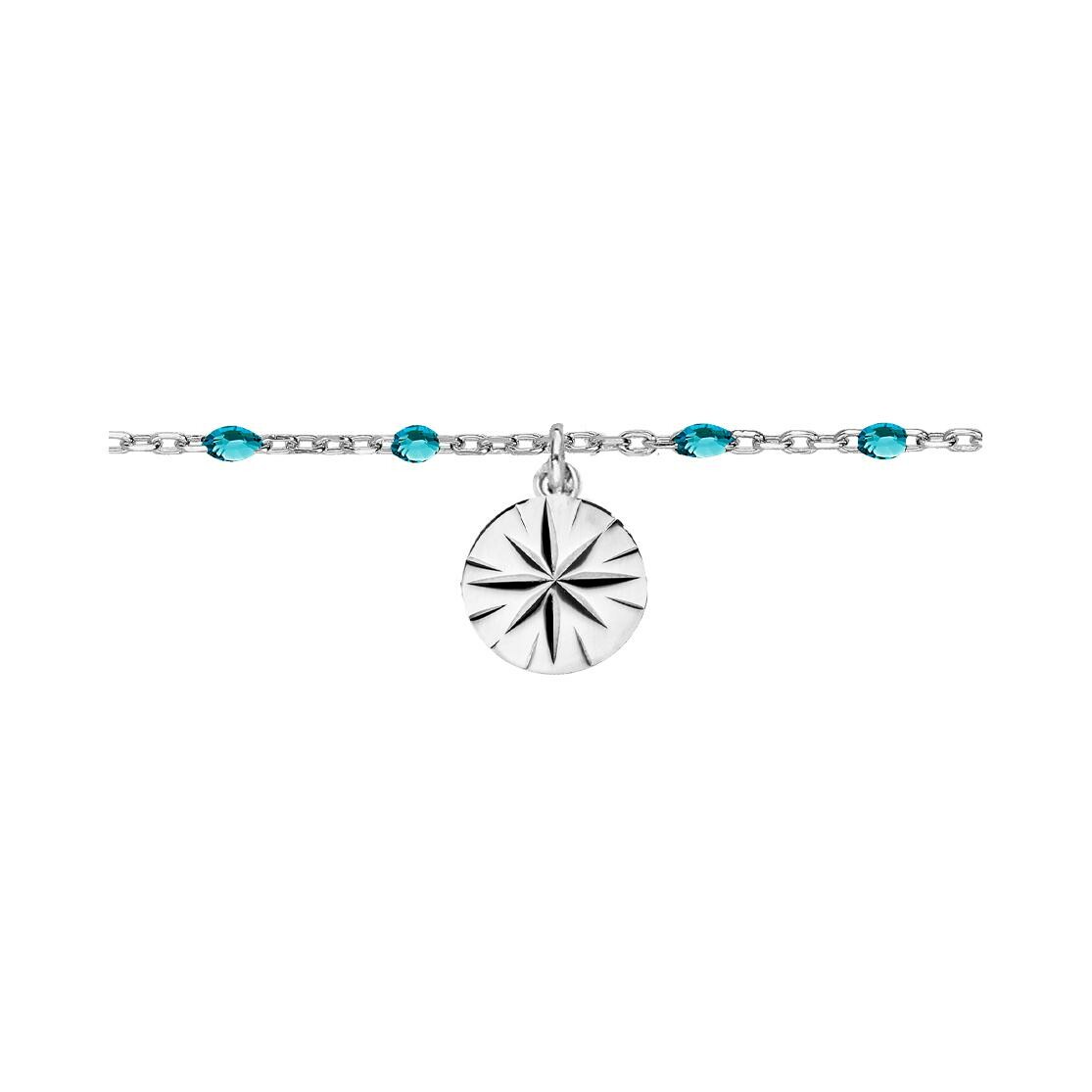 Chaîne cheville argent rhodié olives résine bleu transparent et soleil diamanté 23+3cm